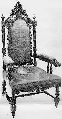 Born in Shaftsbury, Vt., Galusha (1804-1871) moved to Troy by 1825 and reportedly apprenticed with H.M. Smith. Although it is not clear that Galusha trained in Shaftsbury, his age and the presence in the community of established cabinetmakers such as Daniel and Asa Loomis make it probable that Galusha had some training before he moved to Troy. By 1828 Galusha opened his own shop at 307 River Street. While no documented pieces from this period are extant, attributed pieces indicate that he followed the architectural outlines and classical inspiration of traditional Empire-style furniture. Galusha's 1828 Troy Sentinel advertisement, which featured a line drawing of an Empire-style work table with a pillar base and carved legs, and the inclusion of Pembroke and "Pillar & Claw" tables in his inventory, document his stylistic predilections. Galusha's reputation spread rapidly and within two years his success enabled him to expand his inventory. His 1830 advertisement is lengthier than the one from 1828 and lists a greater diversity of stock. Right: Rosewood armchair, circa 1865-1870. Munson-Williams-Proctor Institute, Utica, N.Y. |