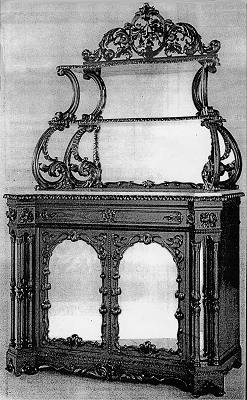 Galusha had competition from a number of smaller Troy cabinetmakers including Rober Green (active circa 1840 to circa 1868) and from John Meads, Jr., of Albany (active circa 1838 to circa 1852), but among wealther clientele his main competition came from New York City firms such as Alexander Roux, John Henry Belter, E.W. Hutchings, and J. and J.W. Meeks. Documented Galusha furniture from the 1840s and 1850s confirms that he emulated the work of his New York City counterparts. His forms were typical of the period and his motifs were derived from popular stylistic ornamentation. Galusha, however, added embellishments that distinguish his work from that of other manufacturers. The patronage that Galusha received from prosperous local customers, such as Richard P. Hart and John Paine Nazro families of Troy and the Col. Robert Milligan family of Saratoga, N.Y., who could afford furniture by prominent New York City cabinetmakers, testifieds to the quality of Galusha's workmanship. For all three families, Galusha produced Rococo parlor sets consisting of sofas, side and armchairs, and center tables, in keeping with the Nineteenth Century trend of purchasing furniture en suite. Right: Etagere, circa 1850. Munson-Williams-Proctor Institute |