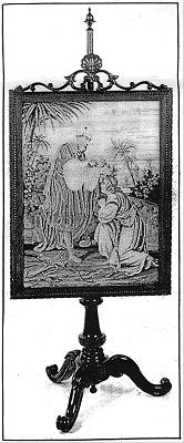 Galusha ornamented his furniture, which was made primarily of rosewood, with floral motifs. Each chair in a suite, however, was slightly different. Several motifs predominate in Galusha's work; flowers, such as daisies and primroses with the stems held together in ribbon; scallop shells; gadrooning; and applied wavy trim. Galusha did not adopt the advanced production techniques of some of his contemporaries such a Belter's lamination process. Instead, he continued to work in a more conventional mode using traditional joinery techniques, carving embellishments from solid pieces of wood, and applying carved elements to flat surface in order to achieve greater depth in the ornamentation. Many of his more elaborate pieces combine decorative techniques. Right: Screen, circa 1840-1850. Rosewood, needlepoint. Collection of Rensselaer County Historical Society, Troy, N.Y. |