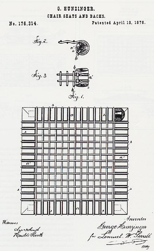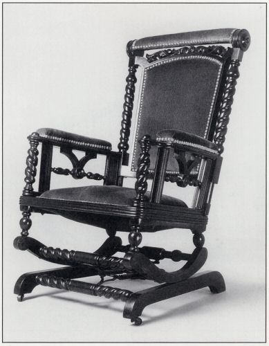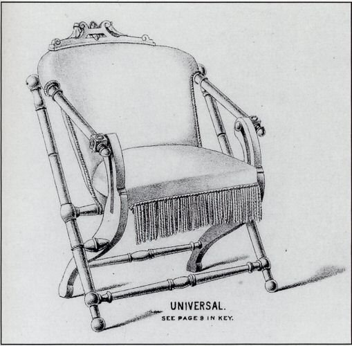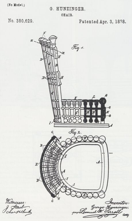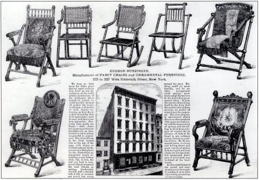 The Platform Rocking Chair In 1882 Hunzinger secured a patent for a platform rocker that was to be his commercially most successful chair type (fig. 130). Hunzinger was not the inventor of the platform rocker and had, in fact, been making them since at least 1876 with a preexisting spring system. The platform rocker differs from more common rockers with runners by rocking in place on its own base with the help of springs. Americans seem to have been especially fond of the rocking chair, whereas Europeans associated the rocking chair with invalidism and infirmity. Traditional rocking chairs on runners tended to take up more room and make more noise than platform ones. They also tended to creep along the floor when in use. Experiments with platform rockers begain in the United States in the late 1860's. J. Wayland Kimball remarked in his often-cited catalogue: "Foreigners call the rocking chair a peculiarly American luxury, yet the necessary length of the rockers on the floor cause[s] this favorite chair to be occasionally in the way, and not infrequently too noisy for comfort. These disadvantages have been very ingeniously overcome in the chairs of certain makers who, in different ways, build them so that there is no rocker on the floor and the movements are always noiseless."... .....Hunzinger, then, was entering a well-established market for platform rocking chairs. The patent letter tells us that Hunzinger was well aware of the challenges of this form and the concerns of the consumer: Rocking-chairs have stationary bases for resting upon the floor have long been regular articles of manufacture; and said chairs have contained the springs and other devices in a number of forms to connect the stationary base and the rockin-chair to return from either end of its movement to a normal position. My invention relates to a device wherein the rockin-chair and stationary base are connected and held together by combination hinge and spring mechanism which insures a stable connection of the parts, and a the same time a positive and easy spring movement. A strip of feltlike textile was often applied to the upper surface of the stationary base to make the rocking movement smoother, and these chairs sometimes retain a paper label with the recommendation: "One drop of oil from your Sewing Machine can in every joint of hinge will prevent noise.".... |