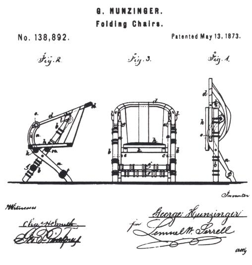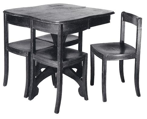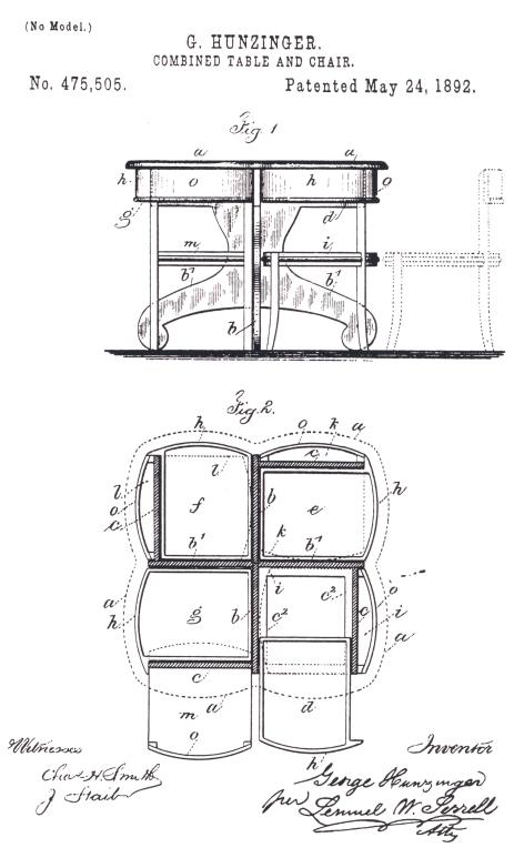 Hunzinger's investigations of new forms and inventions, however, continued. In 1890 and 1892 Hunzinger secured two related patents for nesting chairs and tables (figs. 165 and 166). In the first patent, Hunzinger claimed: This invention relates to a table adapted to fancy articles or to games, and to chairs constructed so as to form part of the table when place beneath it, the tops of the chair-back forming the rim or base of the table-top, and the seats of the chairs forming shelves adapted for bric-a-brac or other articles, and such chairs when removed from beneath the table ar adapted for use as seats.... The table-top... is of any desired shape, preferably circular or elliptical....For small tables the chsir-bottoms will necessarily be small, and... I therefore make the seats so that it can be drawn forward away from the back legs, and this is conveniently accomplished by a central dove-tailed or rabbeted bar... for the convenience of the occupant. The second patent builds on the first. In the patent letter Hunzinger stated: The present invention is a improvement upon the device shown in Letters Pattent No. 433,623....And it is made with reference to the introduction into the table of drawers and fr providing chairs with rectangular seats instead of the trangular seat, ... rendering the table very compact and adapting the same to use in playing various games, because there is a drawer for each chair. In addition to the drawers, this patent also provided for chairs with larger seats and eliminated the need for the sliding mechanism beneath the seats in the first patent. |